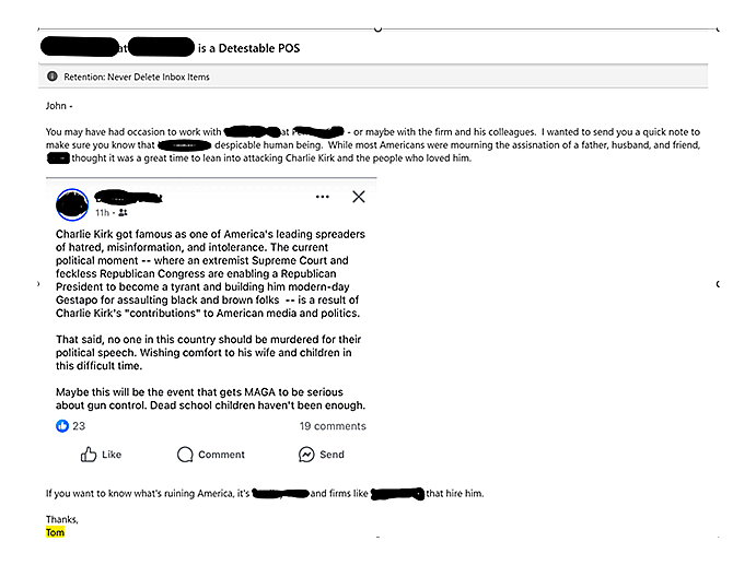 fn: John - You may have had occasion to work with Mr. Biglaw at Big & Law, LLP - or maybe with the firm and his colleagues. I wanted to send a quick note to make sure you know that Mr. Biglaw is a despicable human being. While most Americans were mourning the assisnation [sic] of a father, husband, and friend, Mr. Biglaw thought it was a great time to lean into attacking Charlie Kirk and the people who loved him.